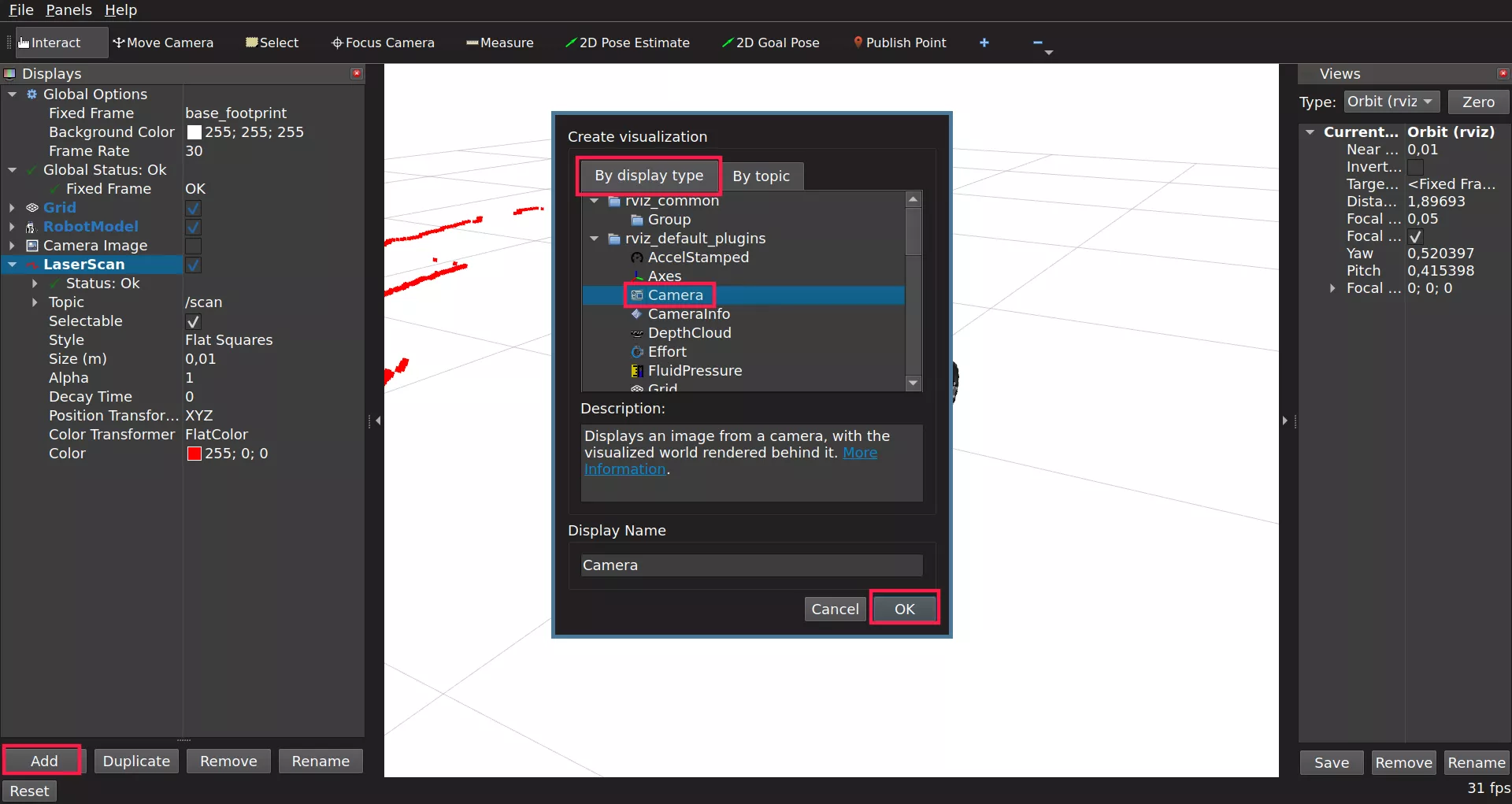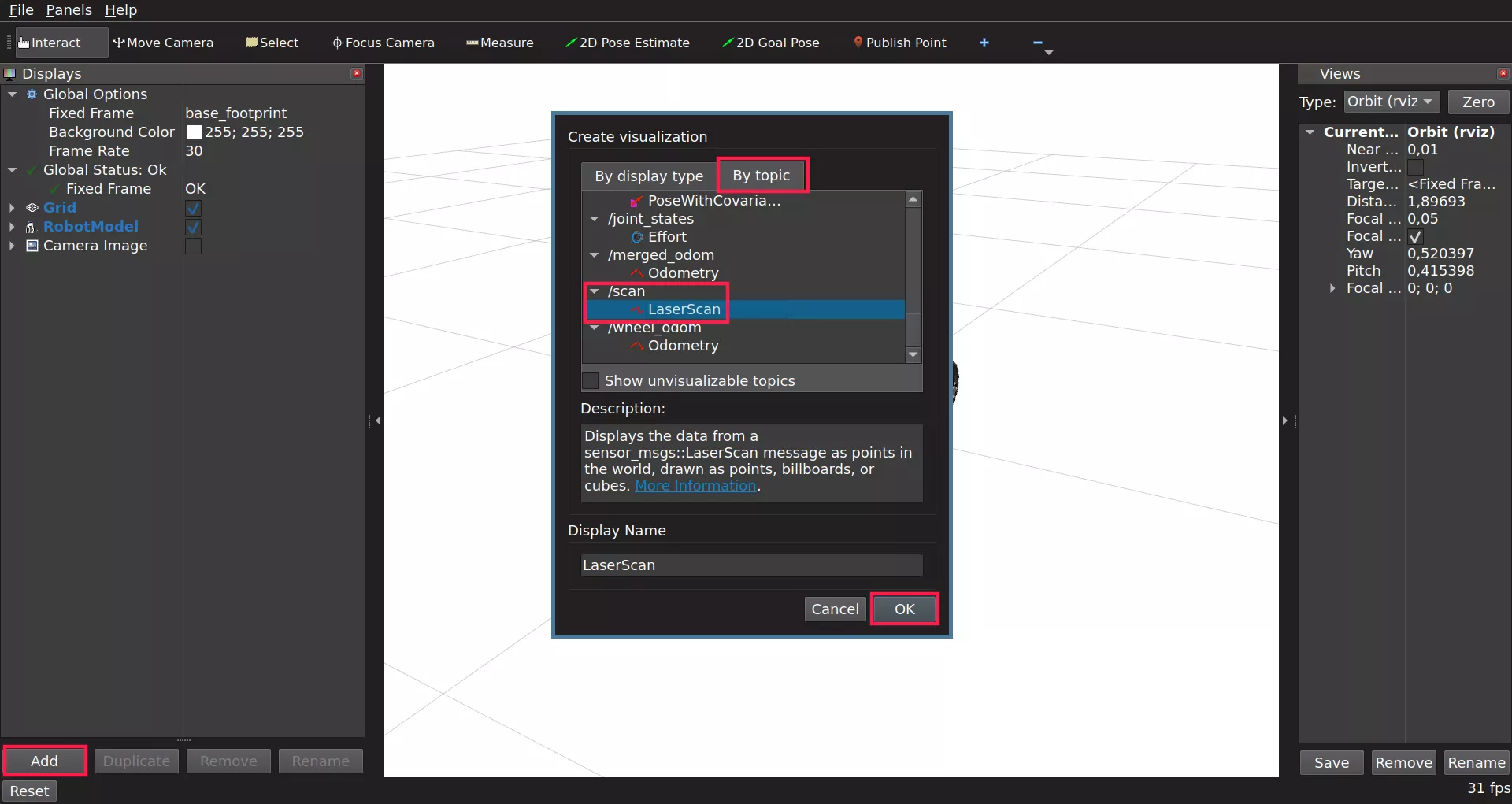On the Displays panel click Add -> By topic and search for the /scan topic. Choose the LaserScan display and click Ok.