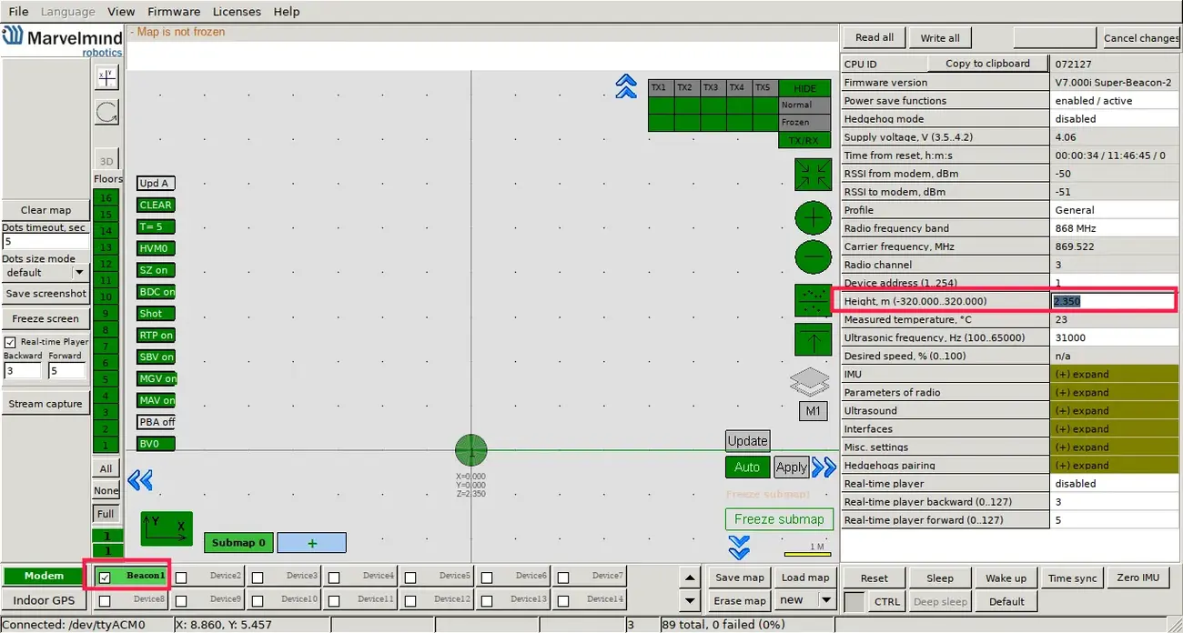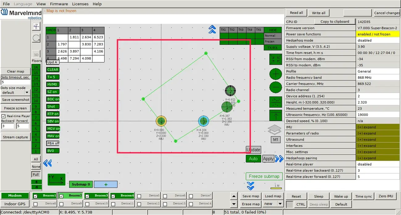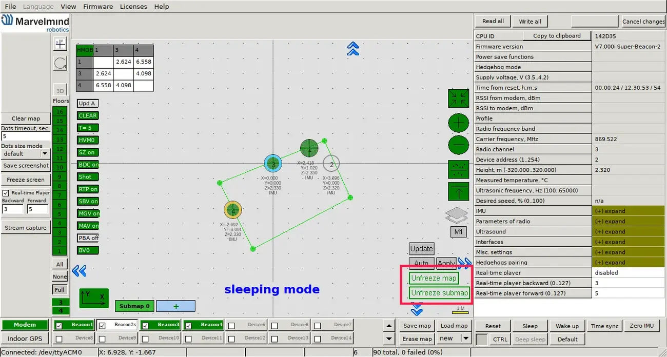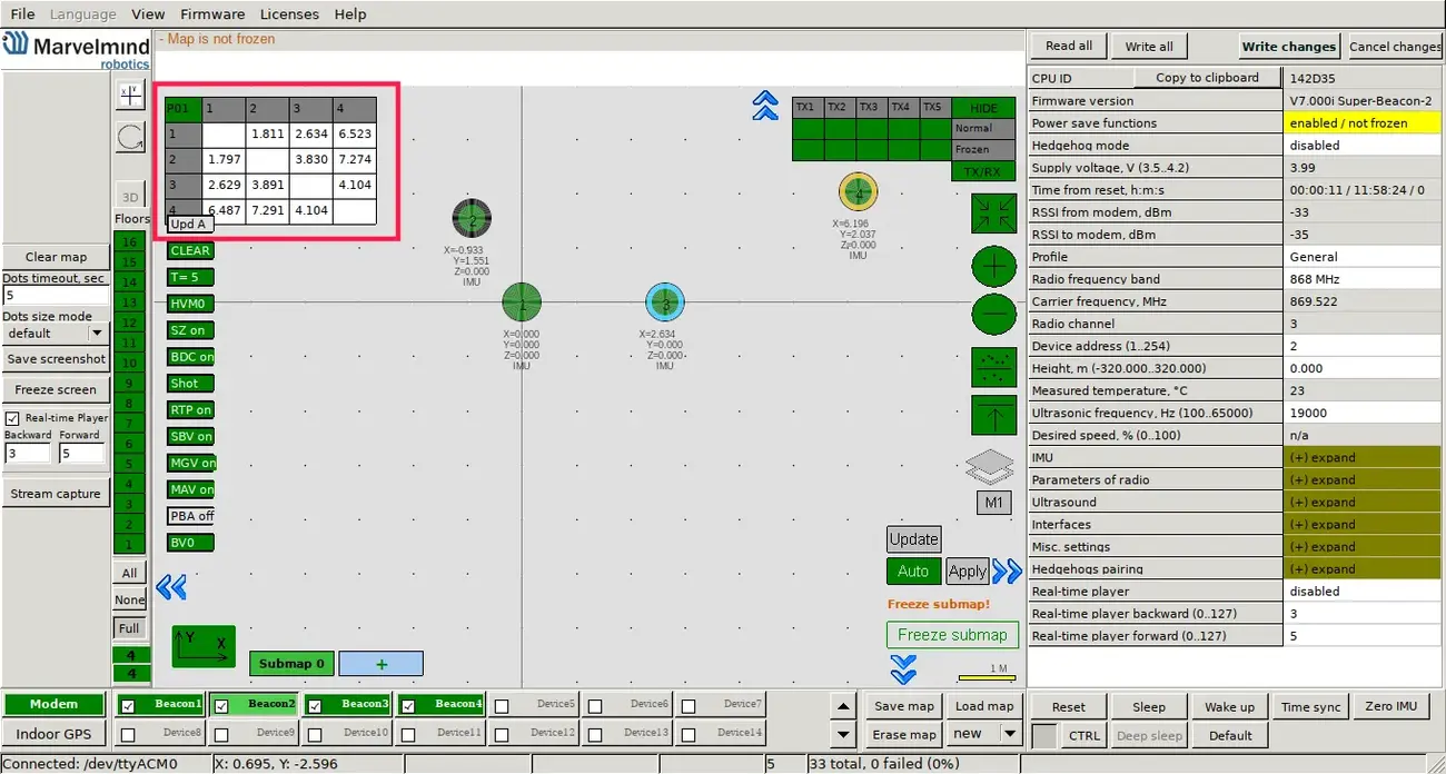 The last step is to freeze the submap and the map (provided that everything in the previous steps was good). When you freeze the map, stationary beacons will stop measuring relative distances and will be ready to measure distance from the mobile beacon.