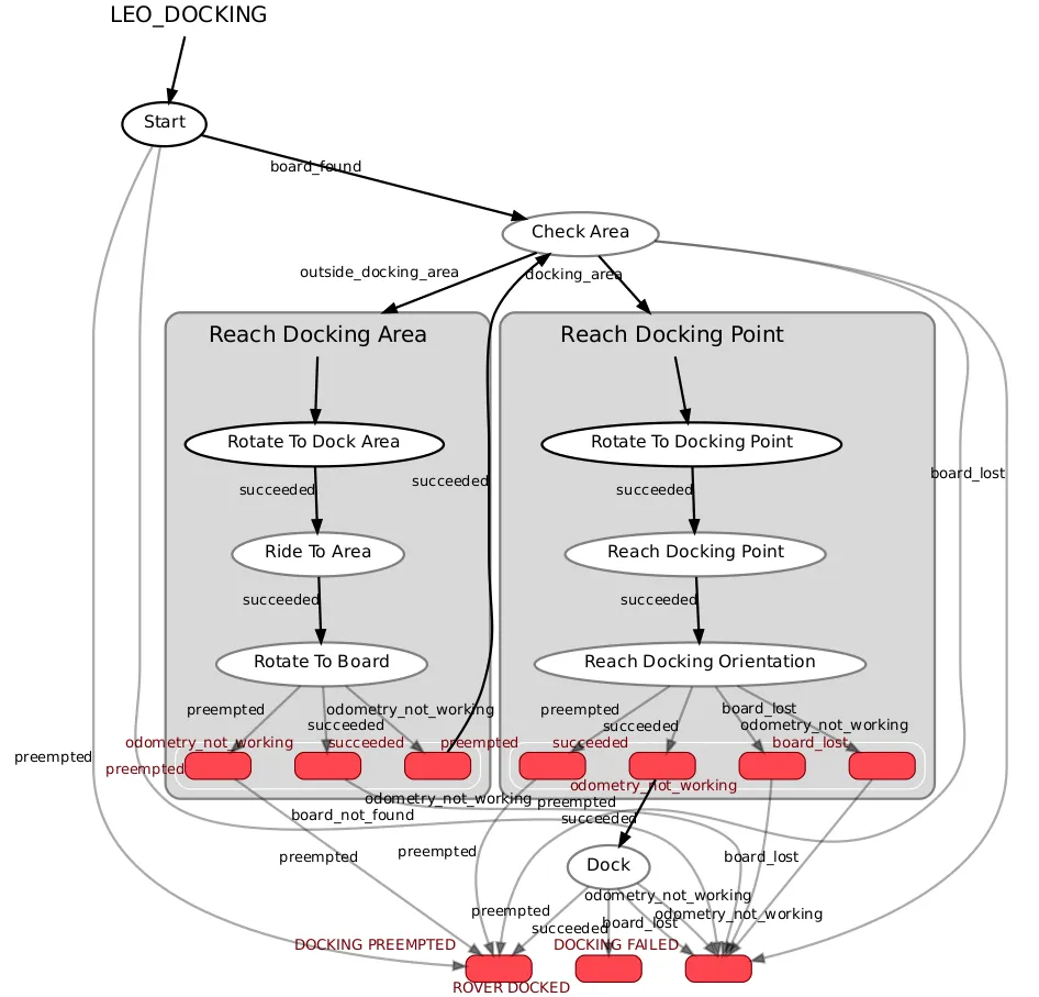 • docking_config.yaml - file with all parameters for the state machine. You can specify there linear and angular speed of the rover in specific states, timeouts and more. Each parameter has it's comment describing what this parameter is used for. There are also a few commented params - you can uncomment them to specify the value for a given state (as long as the param is commented, the value to the state is provided from the global parameter defined in the beginning of the file).